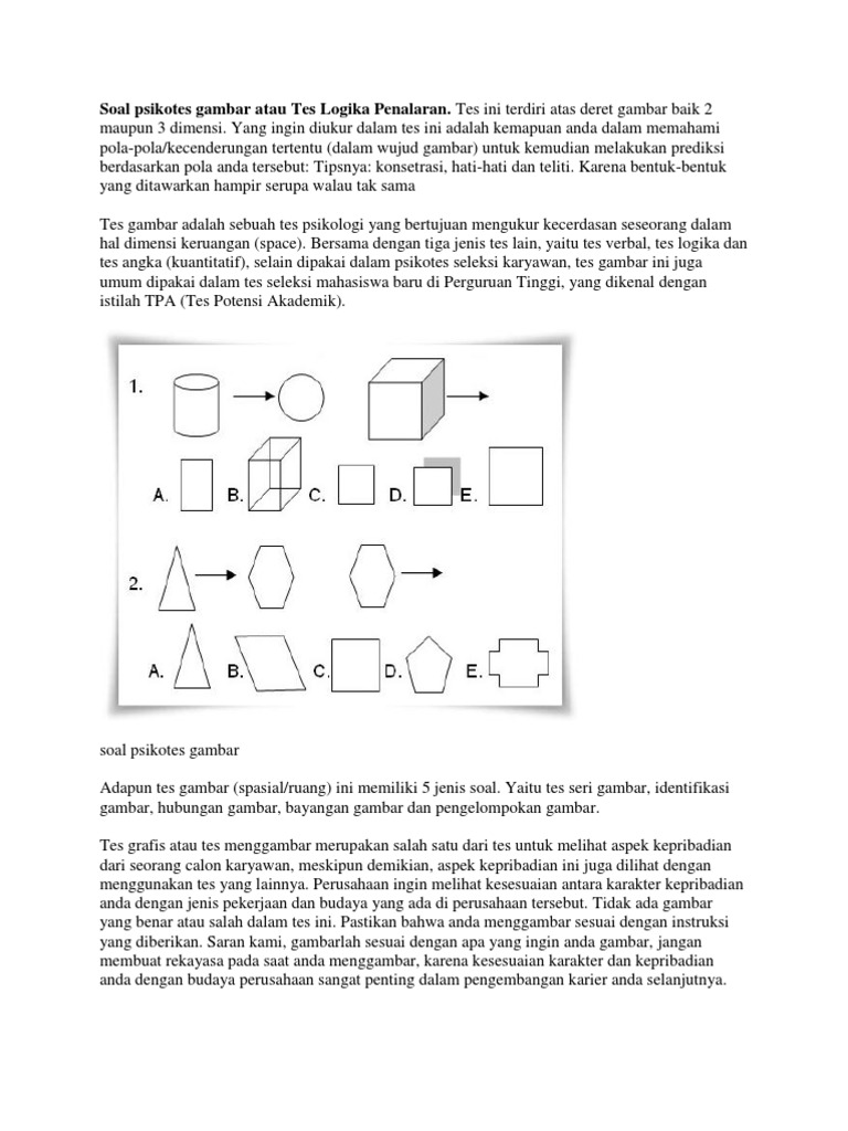Secara umum, logika penalaran lebih menguji kemampuan kamu membedakan atau membentuk suatu bangun ruang. Soal psikotes gambar adapun tes gambar (spasial/ruang) ini memiliki 5 jenis soal. Latihan soal psikotes ini menguji nalar dan logika anda dalam perhitungan matematika, soal psikotes ini sering ditemui dalam tes masuk pelamar kerja. Psikotes memiliki banyak jenis, seperti psikotes matematika, psikotes gambar, psikotes untuk mengukur kemampuan.